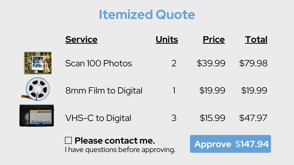 You’ll receive email updates from UPS, and an itemized digitizing quote the same day your package arrives at Heirloom. Digitizing begins only after you approve and pay the quote.